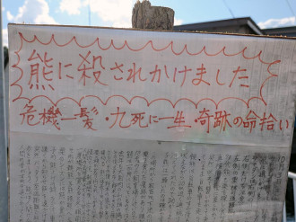 青森市営バス「野沢」バス停隣に現在、クマ出没を注意喚起する手書き看板が立てられている。