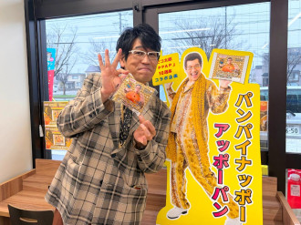 お笑い芸人の古坂大魔王さんが4月10日、「ローソン青森青葉店」(青葉2)を訪れ、代表曲「PPAP」の公開10周年を記念したコラボ商品をPRした。