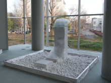 棺桶に入った人をイメージして制作したという長さ180センチのセメント製直方体の作品は、冷たい物を抱きしめることで体温が伝わり「生きていること」を実感する様子を表現。「母の肌をなでてあげるように制作した」と話す中澤さんによると、「かつて命が宿っていた存在」として、石灰化したサンゴなどから作られたセメントを選んだという。