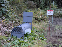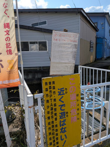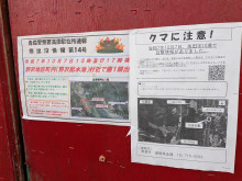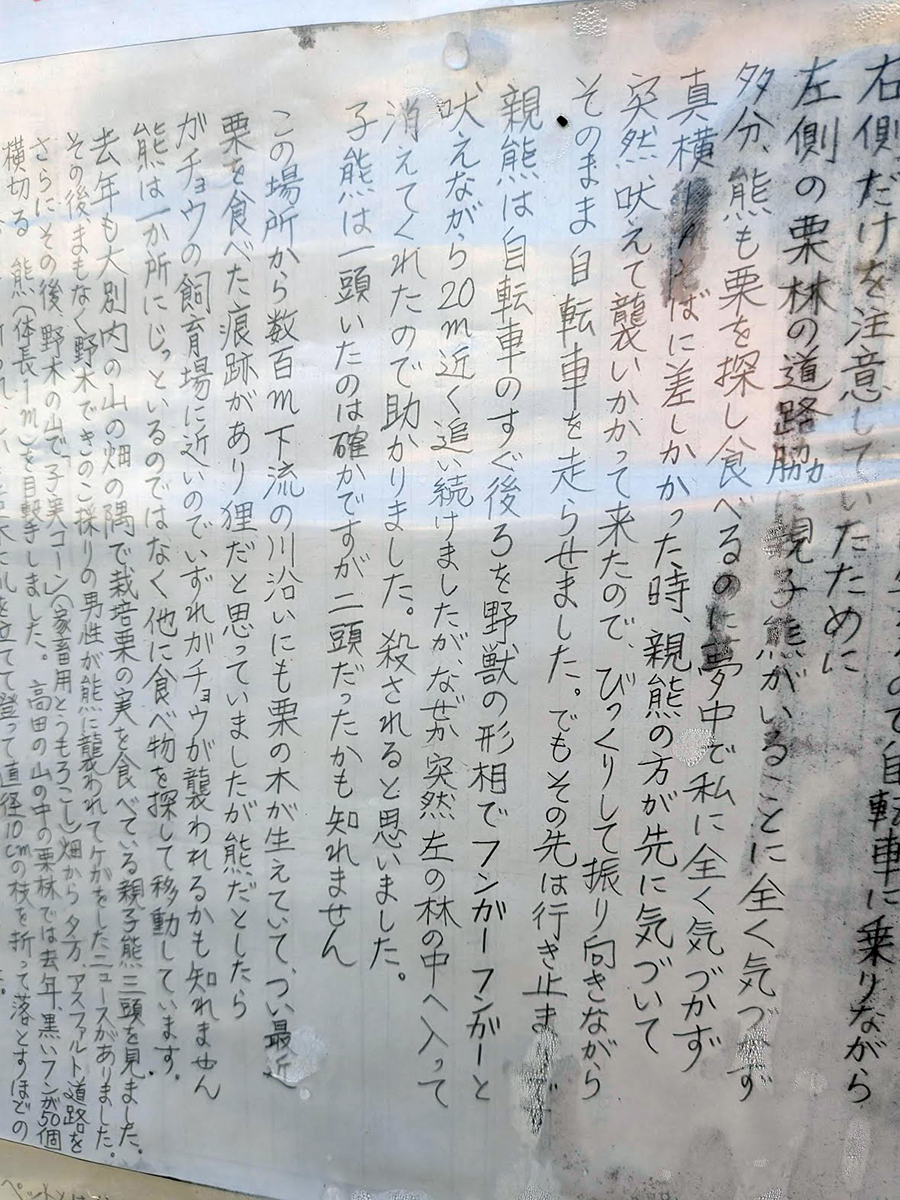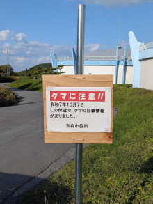 青森市営バス「野沢」バス停隣に現在、クマ出没を注意喚起する手書き看板が立てられている。