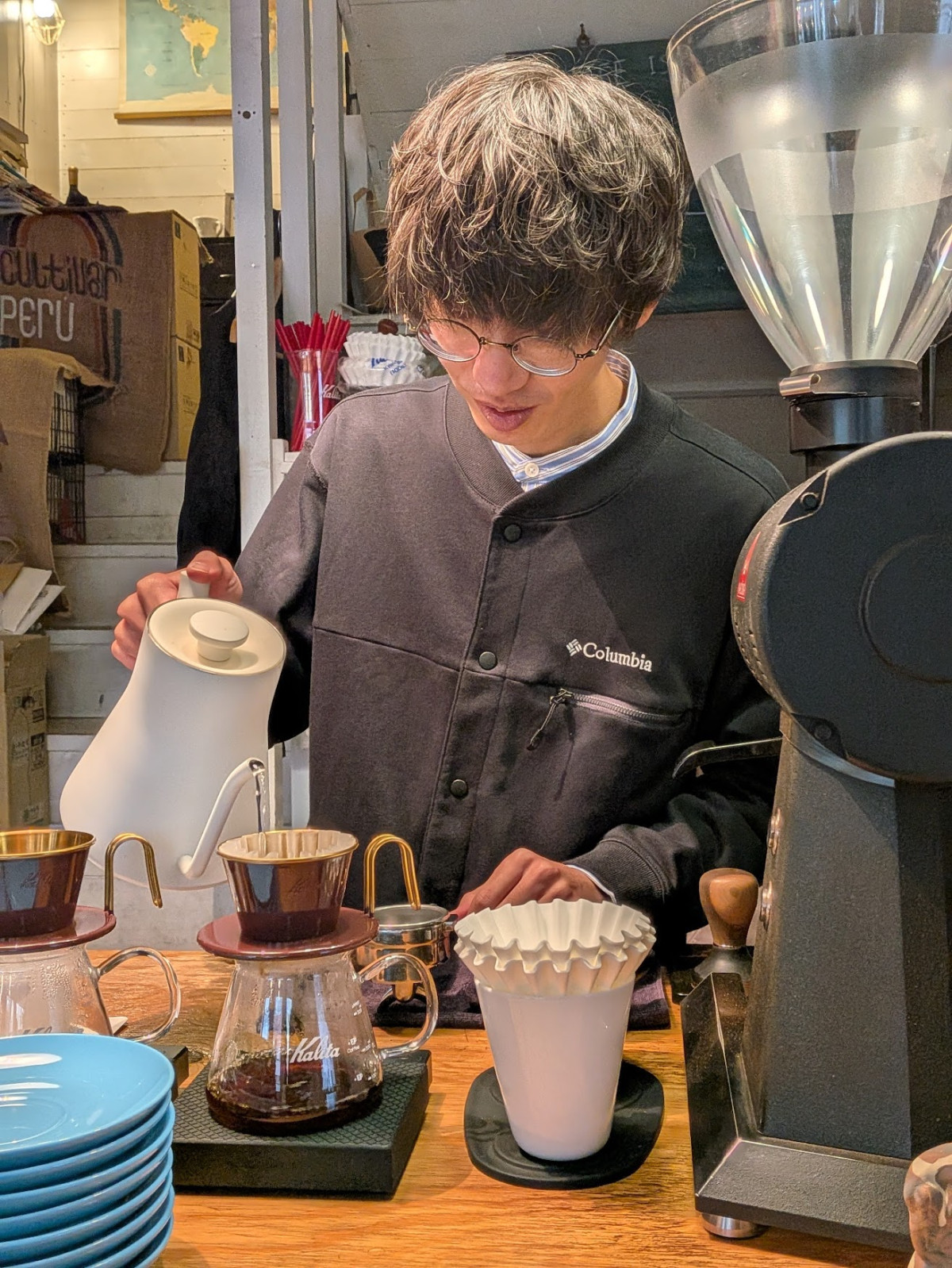 注文してから一杯一杯入れている。近年、橋本さんは「AOMORI COFFEE FESTIVAL」の運営に携わるようになり、エアロプレスの大会実行委員会代表を務めるようにもなった