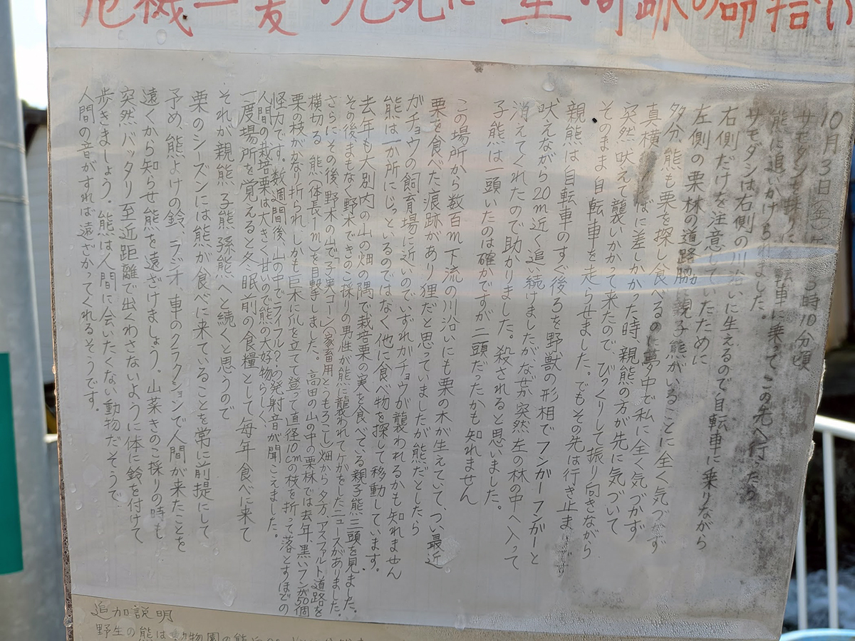 青森市営バス「野沢」バス停隣に現在、クマ出没を注意喚起する手書き看板が立てられている。