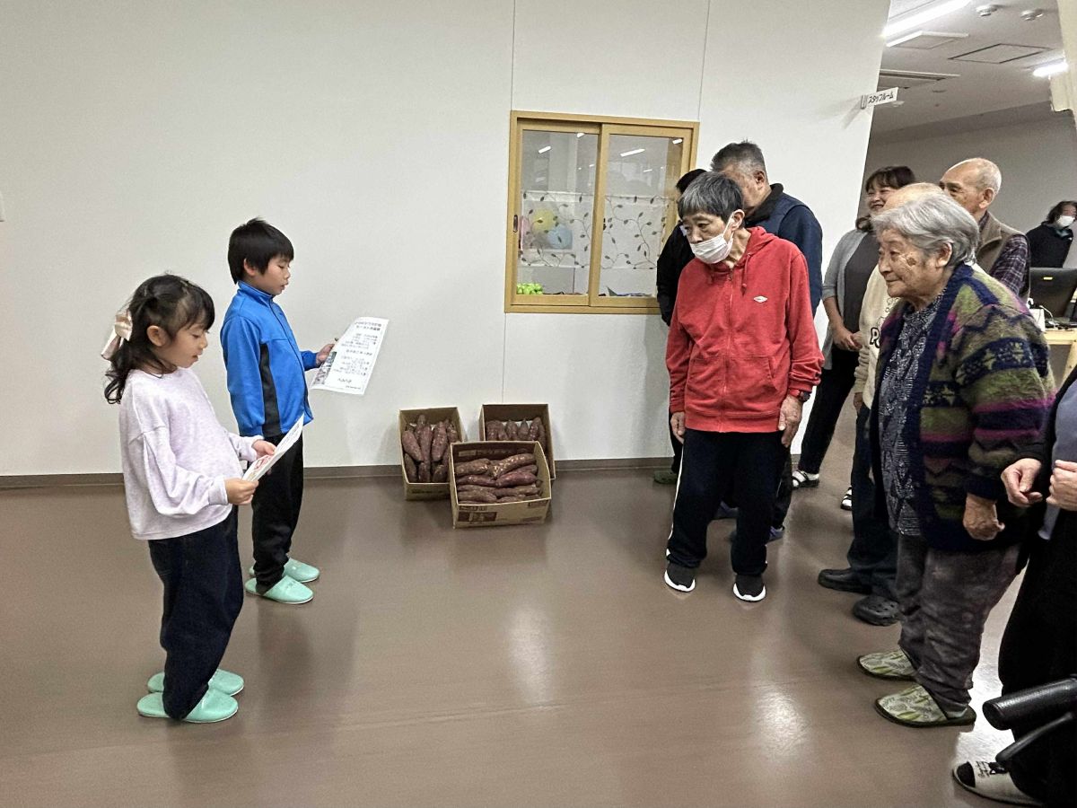 社会福祉活動団体「ボランティアむつの会」が運営する子ども食堂の児童が11月5日、養護老人ホーム「釜臥荘」(むつ市柳町1)に同団体の畑で収穫したサツマイモを贈呈した。