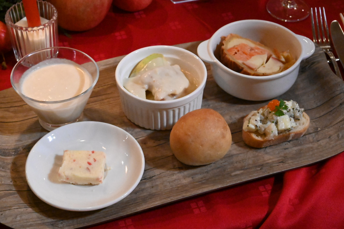 青森県産リンゴを使ったメニュー。リンゴの冷製スープなど