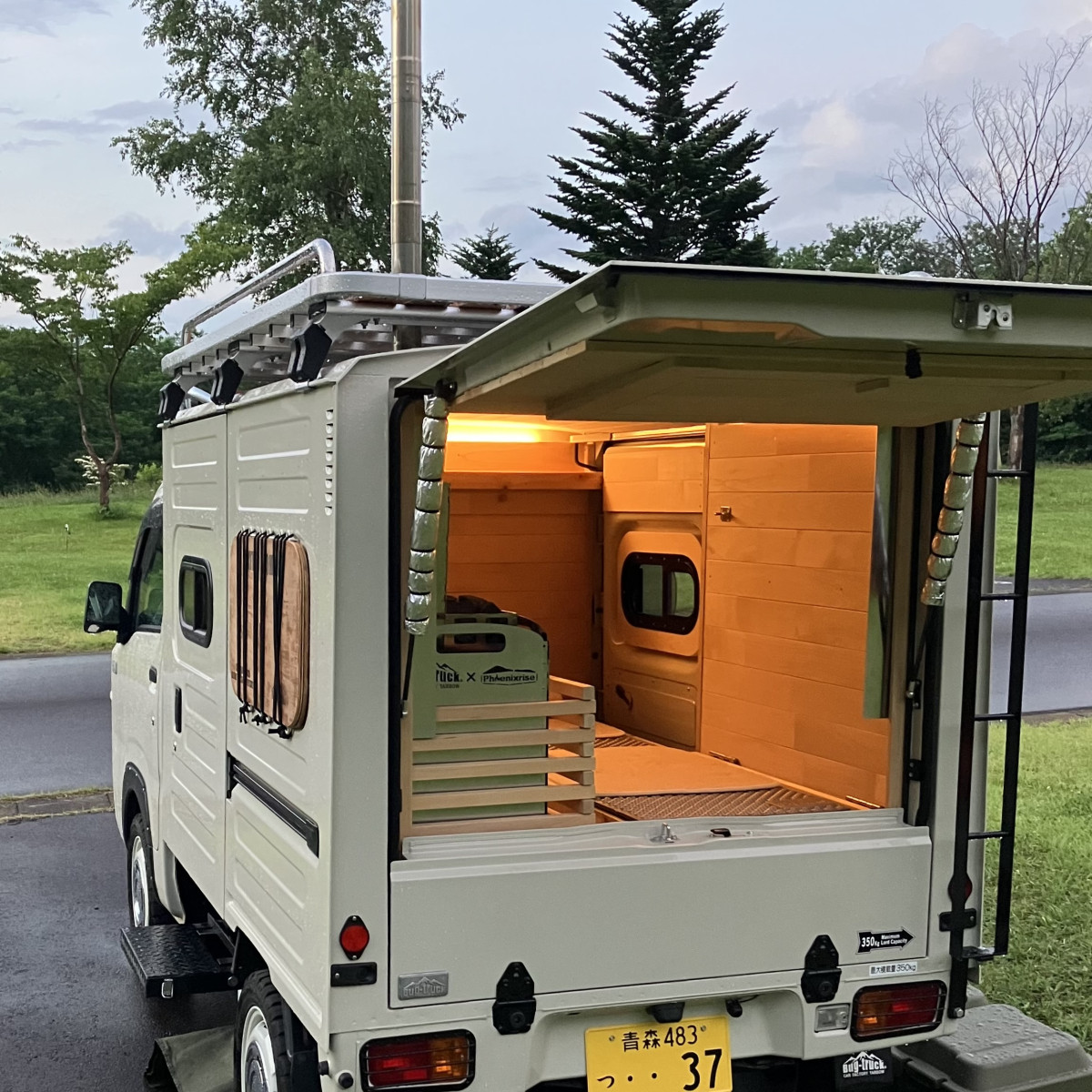 移動式サウナ。ベースは津軽のBug-truck。内装は下北の青森ヒバ