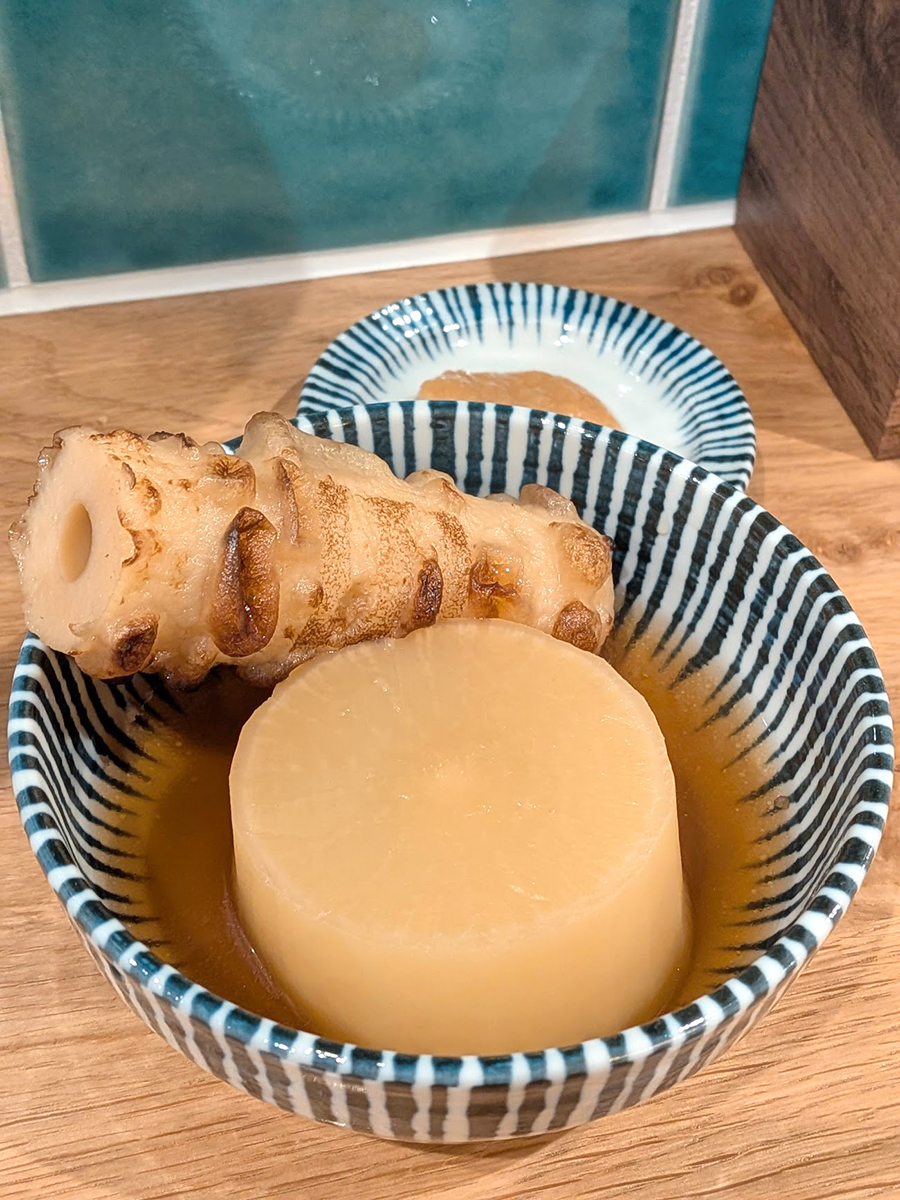 うどんのだしを使ったおでん。大根、こんにゃく、ちくわ、さつまあげ(以上、150円)、牛すじ(250円)、全盛り(850円)