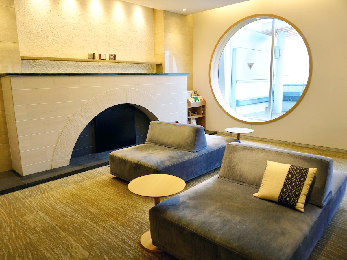 津軽の伝統工芸と北欧インテリアを織り交ぜたロビー一角のゆったりくつろげるソファコーナー