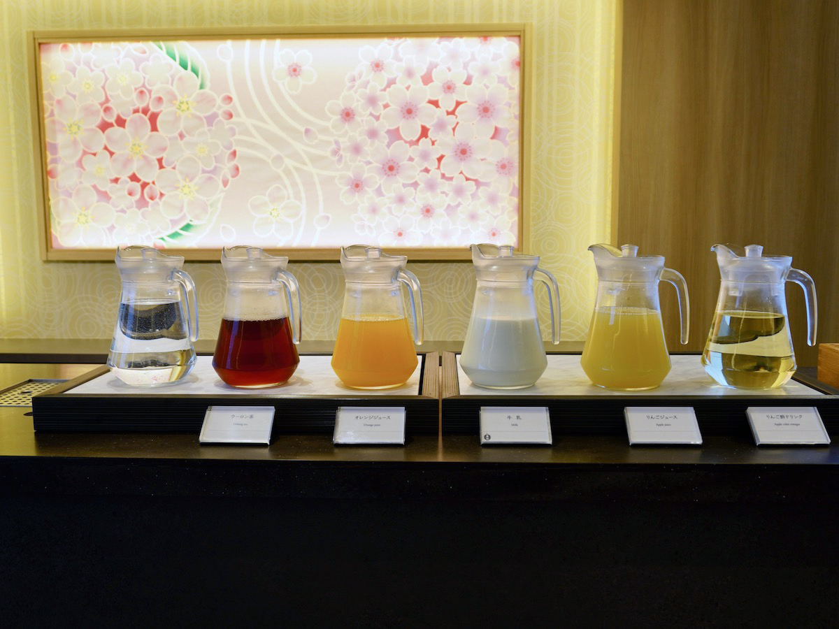 ウーロン茶、オレンジジュース、牛乳、りんごジュース、りんご酢ドリンクなどを用意。後方のアートはツクリダスによるねぶたの和紙で春を表現した作品