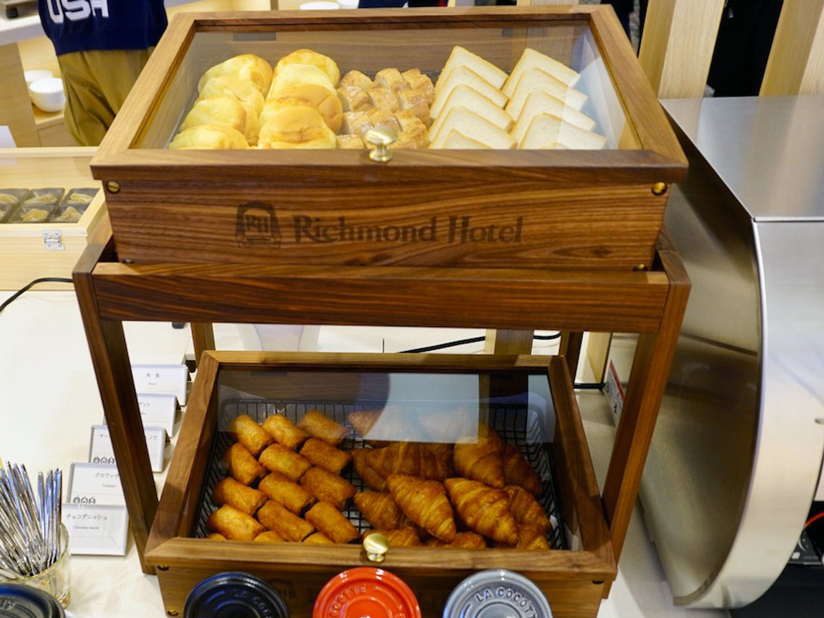 角食、バゲット、チーズ ヴール・ヴィエノワ、クロワッサン、チョコデニッシュといった数種類のパンにジャム、バター、オリーブオイルなどを用意