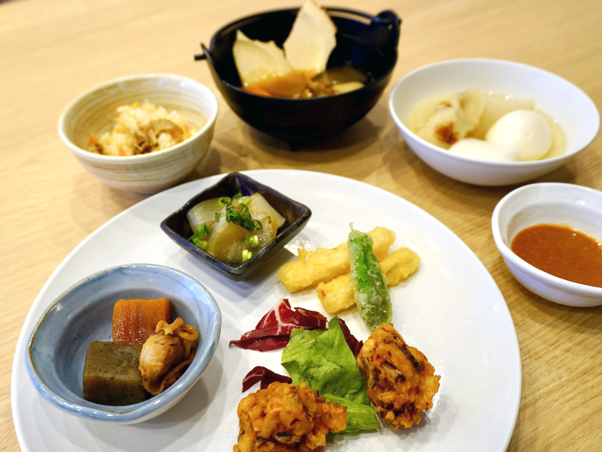 手前の皿の手前から時計回りに「いがめんち」、「ほたて煮」、「ヒラメの漬け」、天ぷら(長いも)。奥左から「ほたての炊き込みご飯」、「せんべい汁」、「しょうがみそおでん」