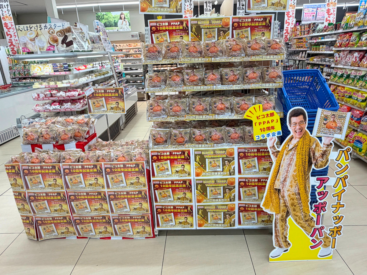 ピコ太郎さん特別パネルとコラボ商品がずらりと並ぶ