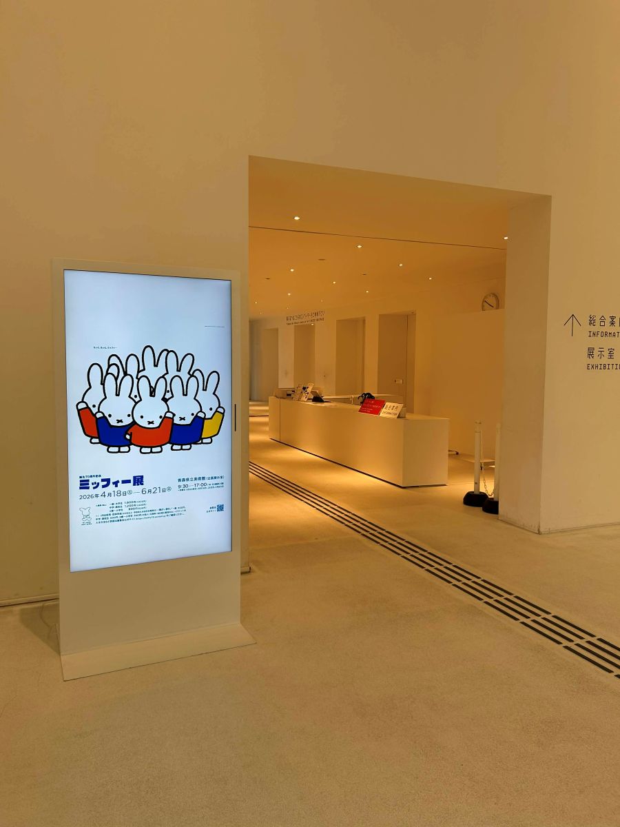 館内入り口に設置された「誕生70周年記念 ミッフィー展」のデジタル看板